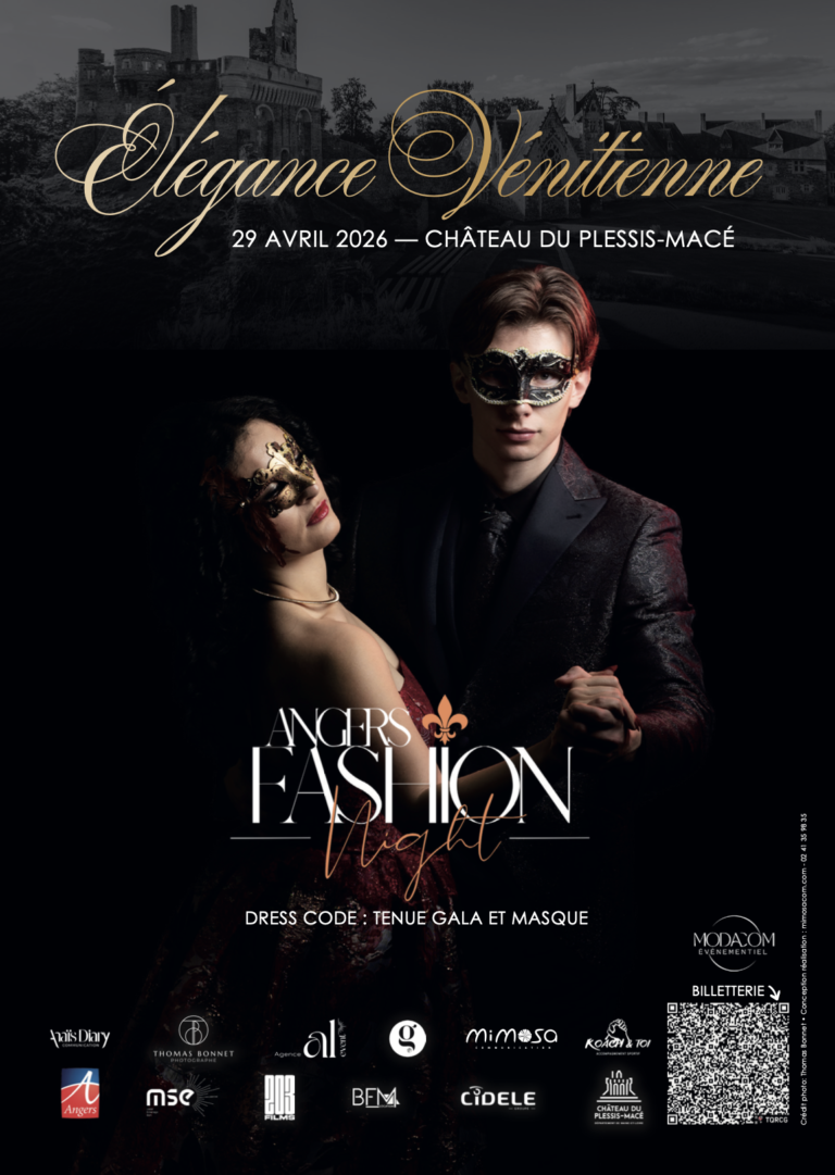 L’édition 2026 d’Angers Fashion Night met à l’honneur la thématique : Élégance Vénitienne. Masques raffinés, tissus somptueux et détails dorés créent une atmosphère mystérieuse et sophistiquée où la mode, l’art et la créativité se rencontrent pour célébrer le raffinement et l’expression personnelle.